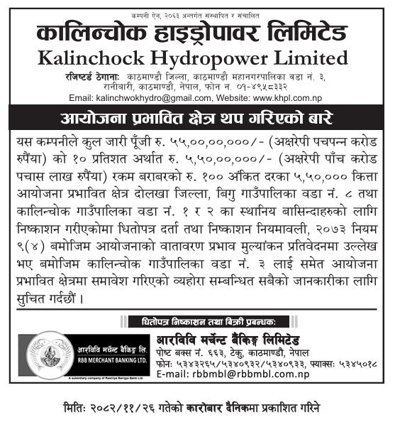 यस कम्पनीले कुल जारी पूँजी रु. ५५,००,००,०००/- (अक्षरेपी पचपन्न करोड रुपैंया) को १० प्रतिशत अर्थात रु...