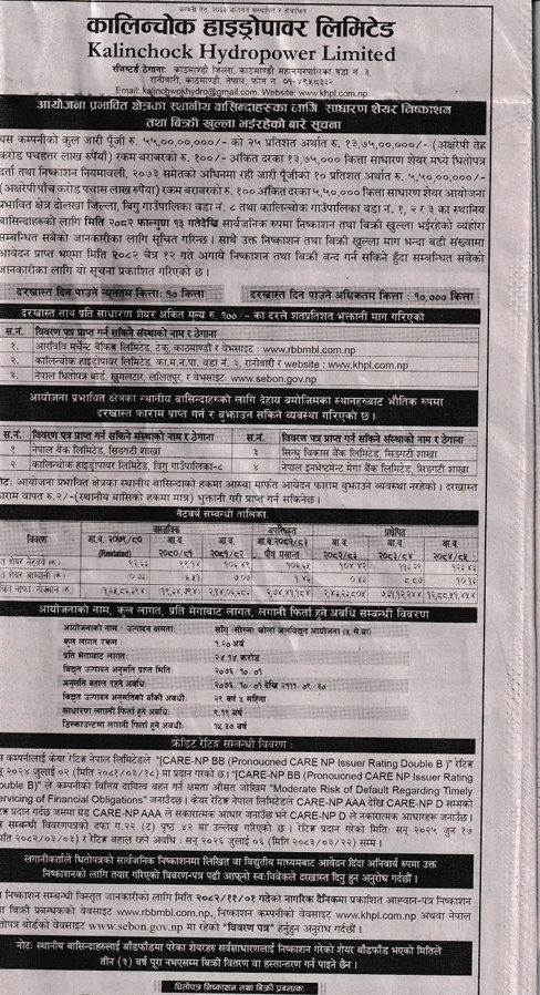Kalinchock Hydropower Ltd. was founded with the objective of developing hydropower projects, led by a diverse and experienced team comprising professionals from various fields such as management, economics, engineering, education, and public affairs. The company is dedicated to achieving excellence in corporate and public governance. Established in the year 2072 B.S., it is supported by prominent figures in the construction, finance, and hydropower sectors, all united in the common goal of generating energy in a safe, dependable, efficient, and environmentally friendly manner through cutting-edge technologies. Kalinchock Hydropower Ltd. is primarily focused on generating and supplying energy, with a primary emphasis on hydropower. To achieve this objective, the company plans to leverage the financial and technical capabilities available within the country to progressively construct projects that contribute to the nation's energy needs and offer attractive returns to its investors.